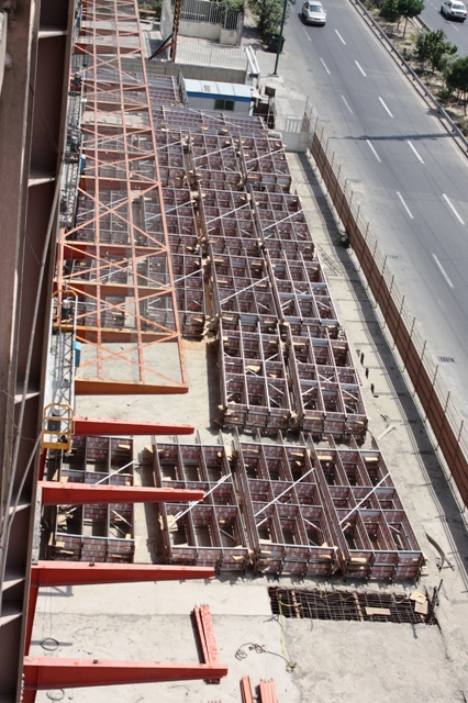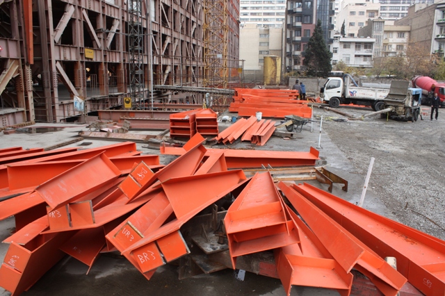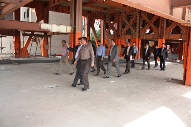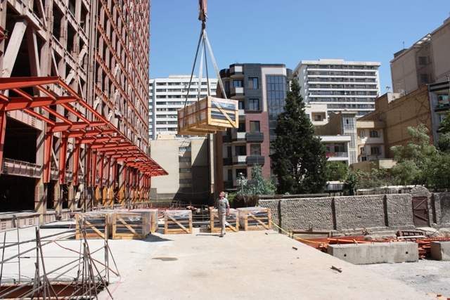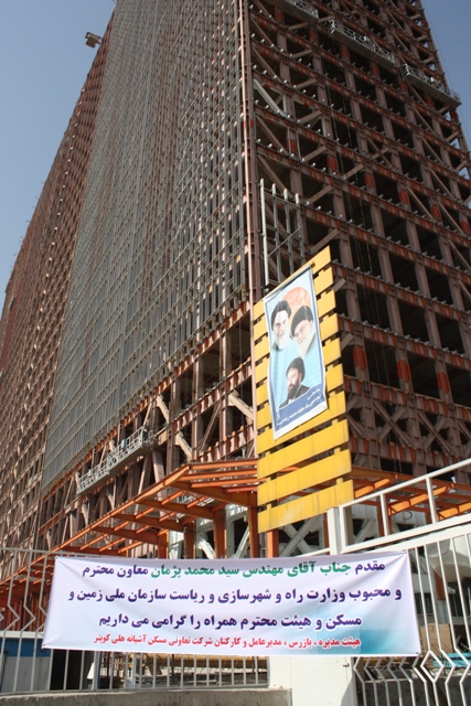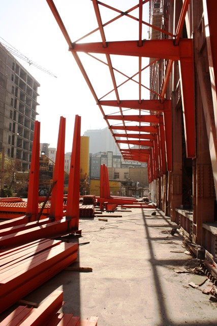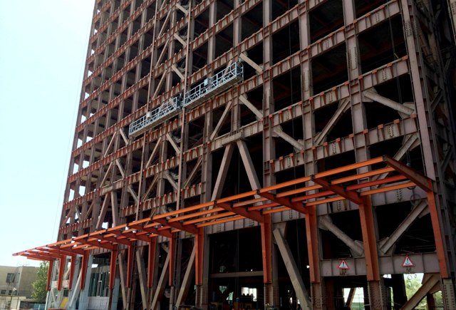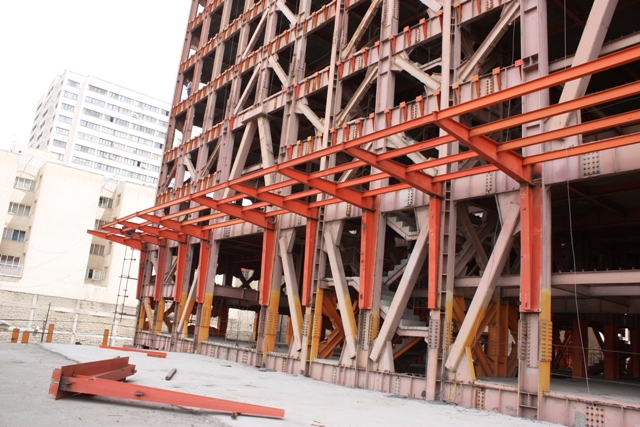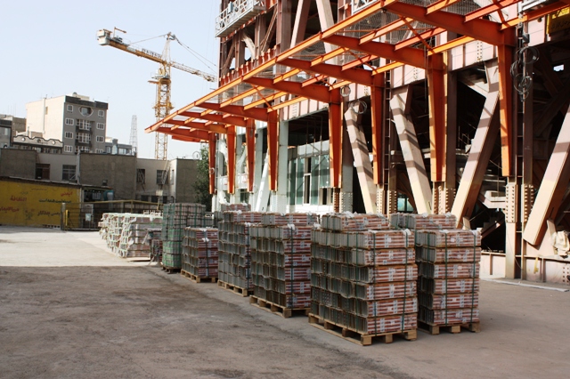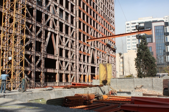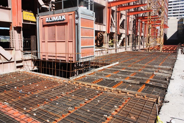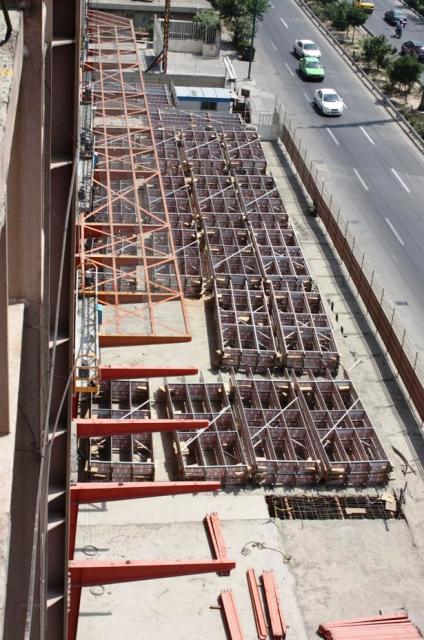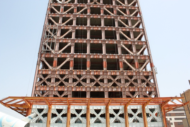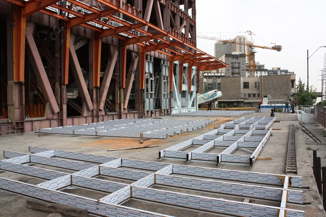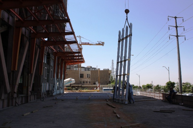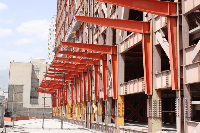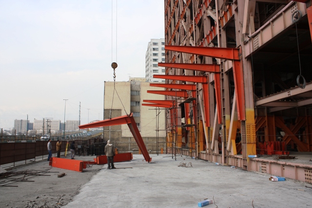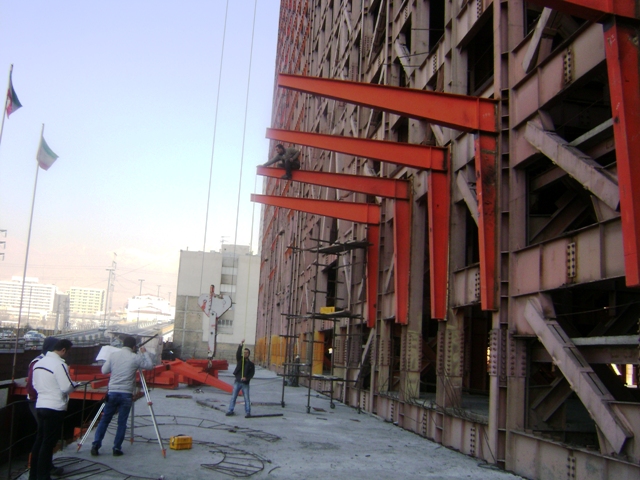 به نام خدا، هم اکنون در بلوک Aساخت، نصب و جوشکاری کلیه قطعات زیر سقفی و پشت بندهای مهاری تیرهای پیرامونی موسوم به قطعه نوع A به تعداد حدود 2000 قطعه به انجام رسیده است، قطعات آنکراژ ثابت موسوم به قطعه نوع B به تعداد حدود 4000 قطعه ساخته و به بدنه فلزی ساختمان نصب شدهاند، نصب دستکهای فلزی اتصال به پانلهای آلومینیومی نما موسوم به قطعه نوع C به آنکراژهای ثابت در وجه غربی بلوک A نیز در این هفته به پایان رسیده است.