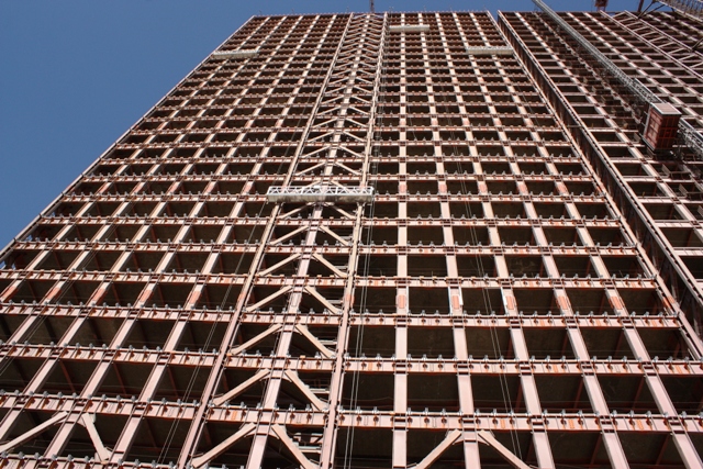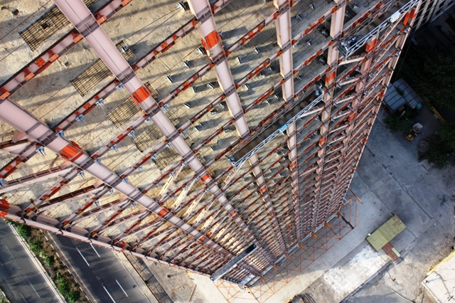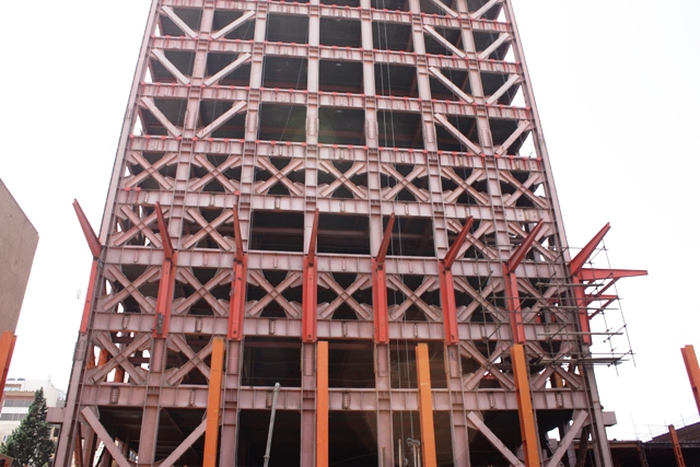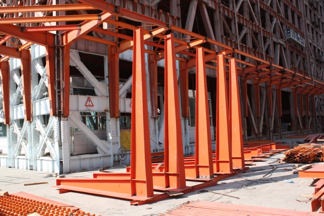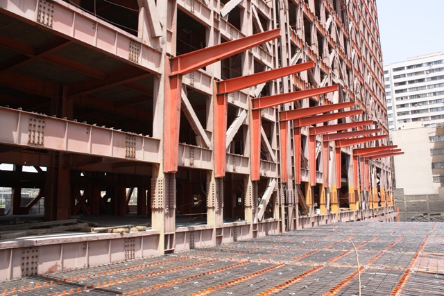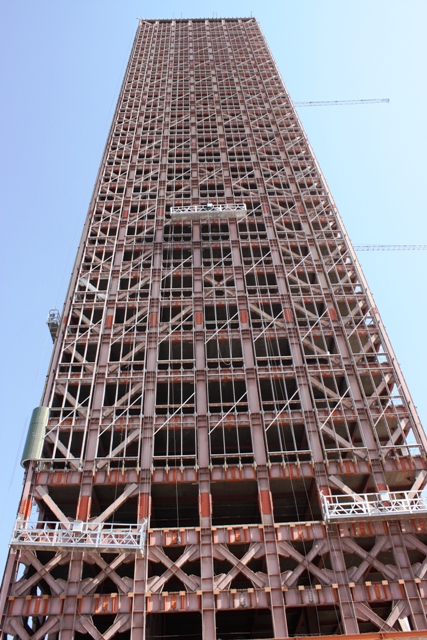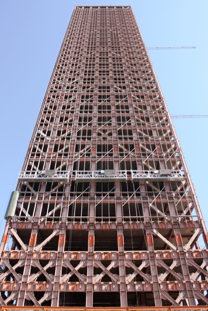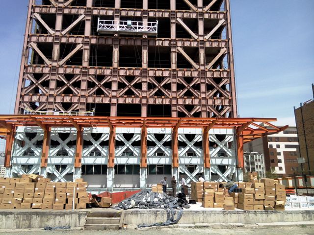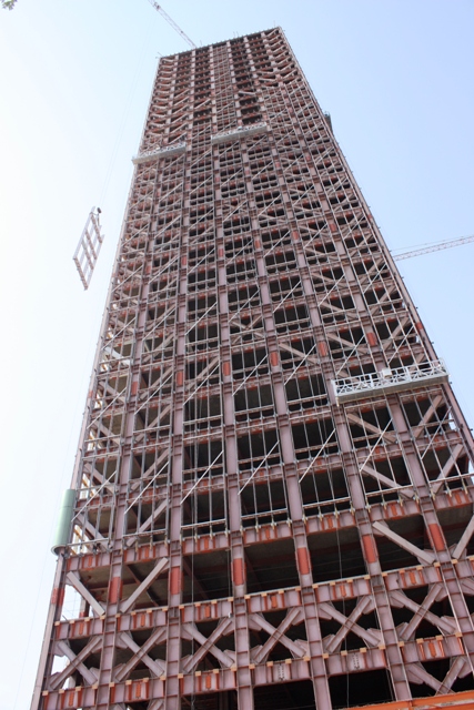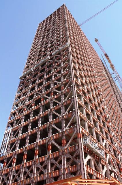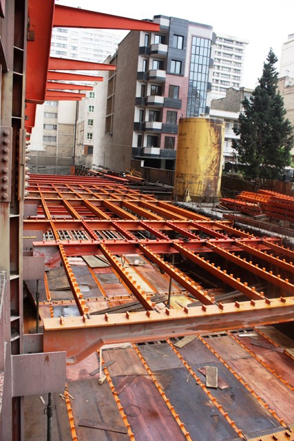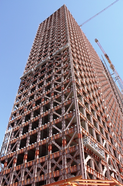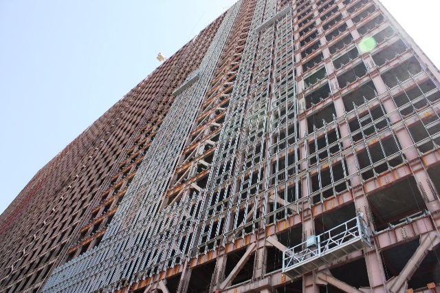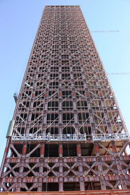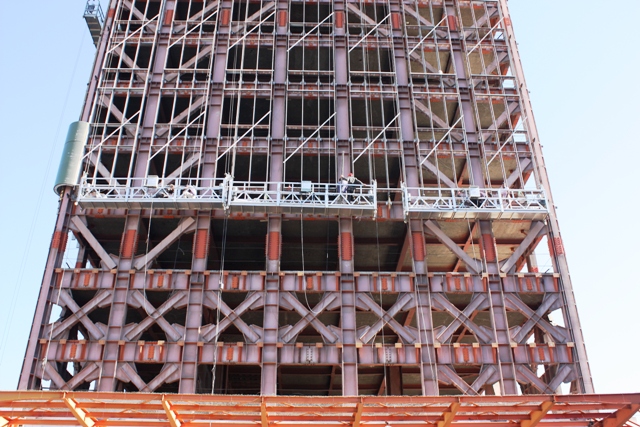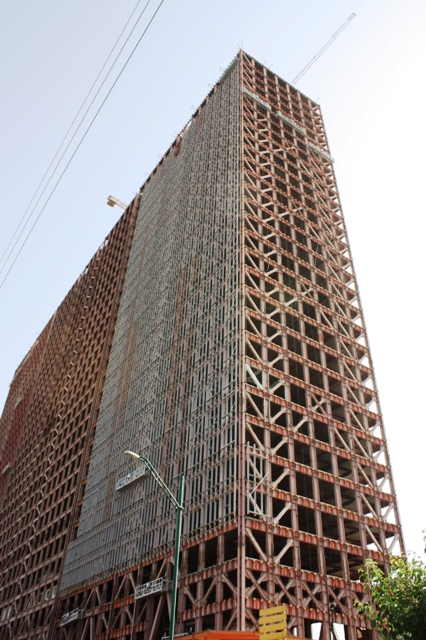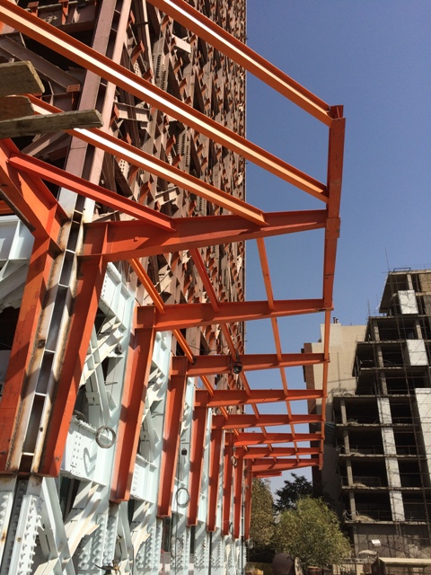 به نام خدا، هم اکنون در بلوک Aساخت، نصب و جوشکاری کلیه قطعات زیر سقفی و پشت بندهای مهاری تیرهای پیرامونی موسوم به قطعه نوع A به تعداد حدود 2000 قطعه به انجام رسیده است، قطعات آنکراژ ثابت موسوم به قطعه نوع B به تعداد حدود 4000 قطعه ساخته و به بدنه فلزی ساختمان نصب شدهاند، نصب دستکهای فلزی اتصال به پانلهای آلومینیومی نما موسوم به قطعه نوع C به آنکراژهای ثابت در وجه غربی بلوک A نیز در این هفته به پایان رسیده است.