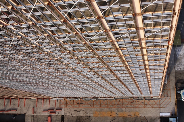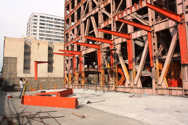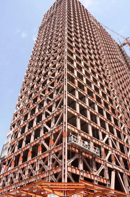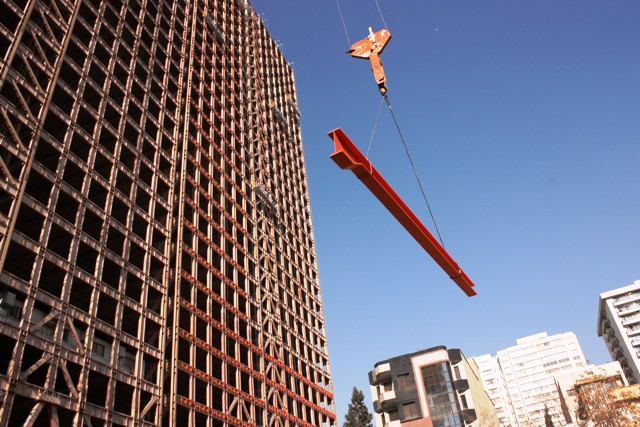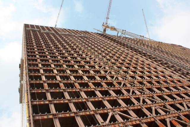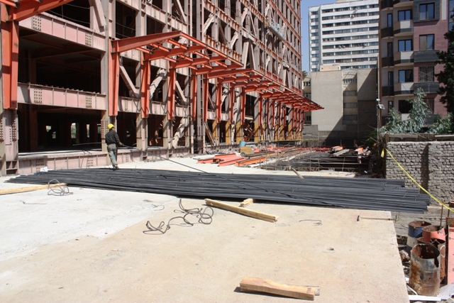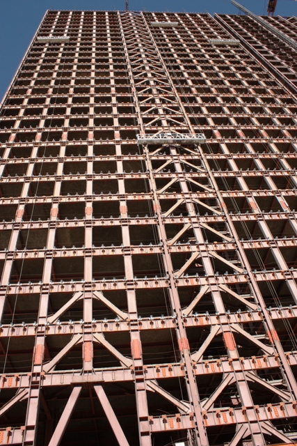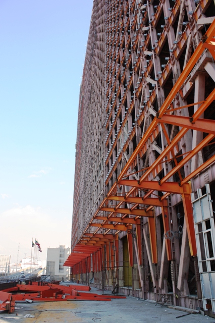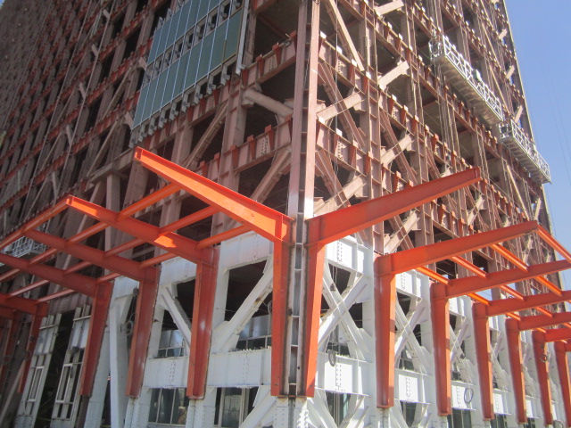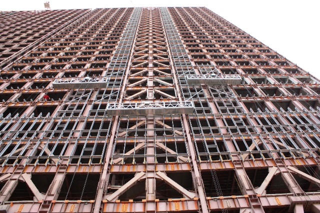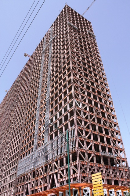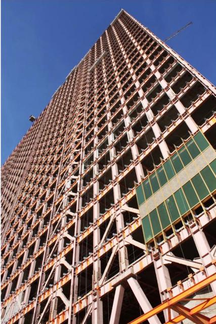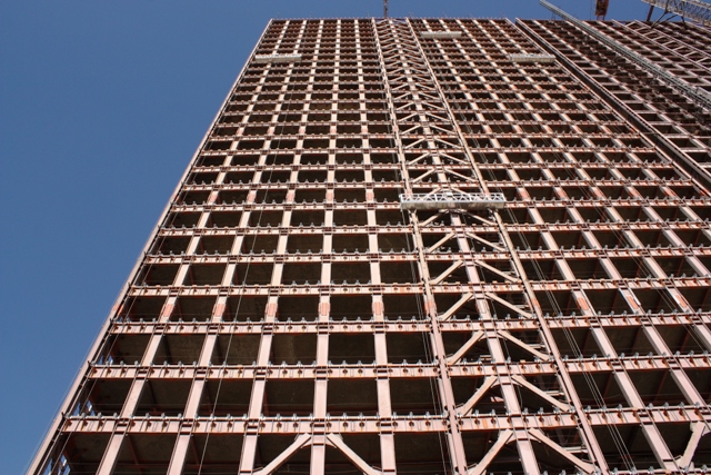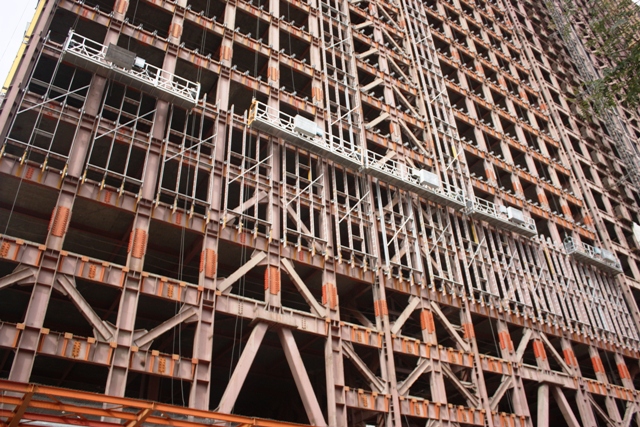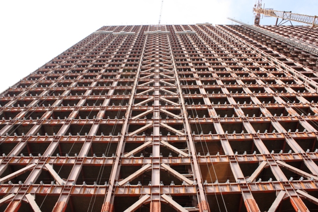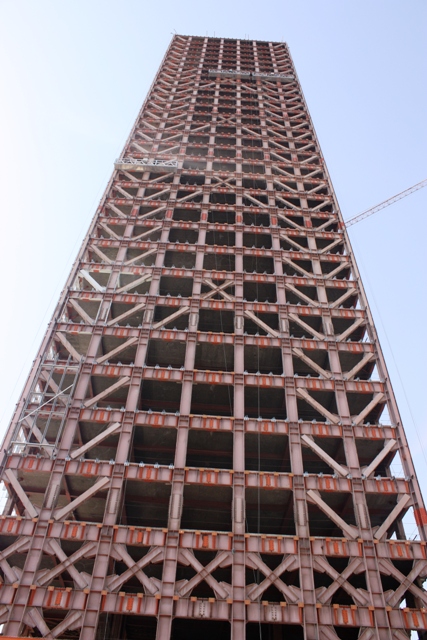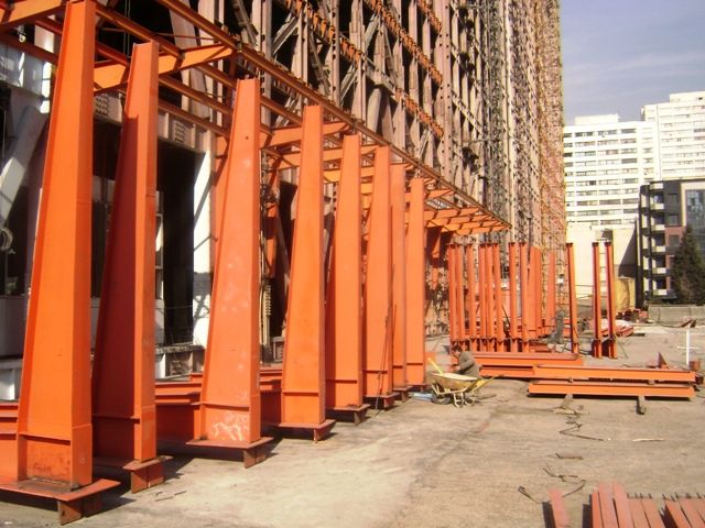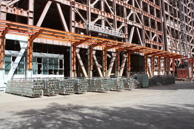 به نام خدا، هم اکنون در بلوک Aساخت، نصب و جوشکاری کلیه قطعات زیر سقفی و پشت بندهای مهاری تیرهای پیرامونی موسوم به قطعه نوع A به تعداد حدود 2000 قطعه به انجام رسیده است، قطعات آنکراژ ثابت موسوم به قطعه نوع B به تعداد حدود 4000 قطعه ساخته و به بدنه فلزی ساختمان نصب شدهاند، نصب دستکهای فلزی اتصال به پانلهای آلومینیومی نما موسوم به قطعه نوع C به آنکراژهای ثابت در وجه غربی بلوک A نیز در این هفته به پایان رسیده است.