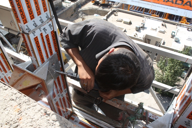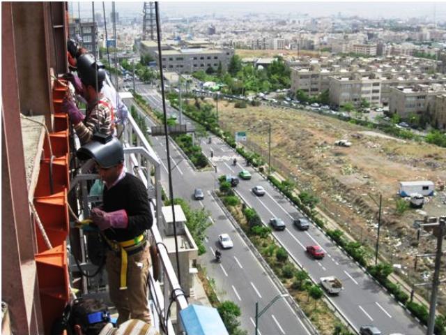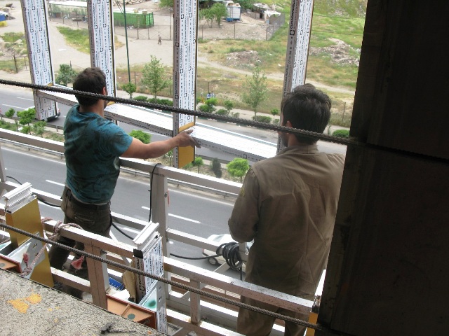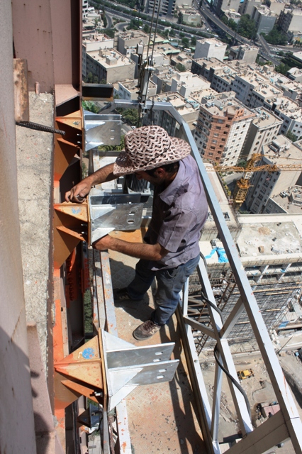 نصب دستکهای فلزی اتصال به پروفیل های آلومینیومی در وجه جنوبی برج A